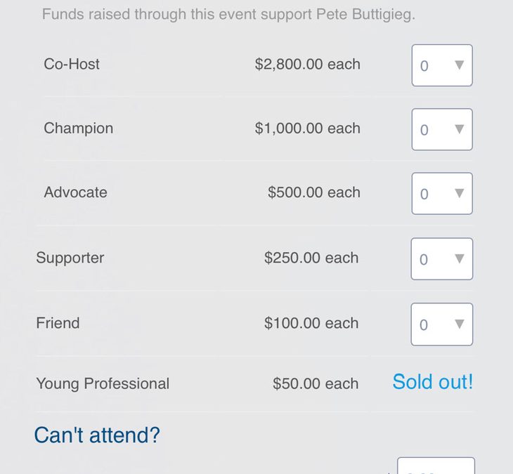 Screenshot of donation form for an evening with Chasten Buttigieg tonight at an undisclosed location