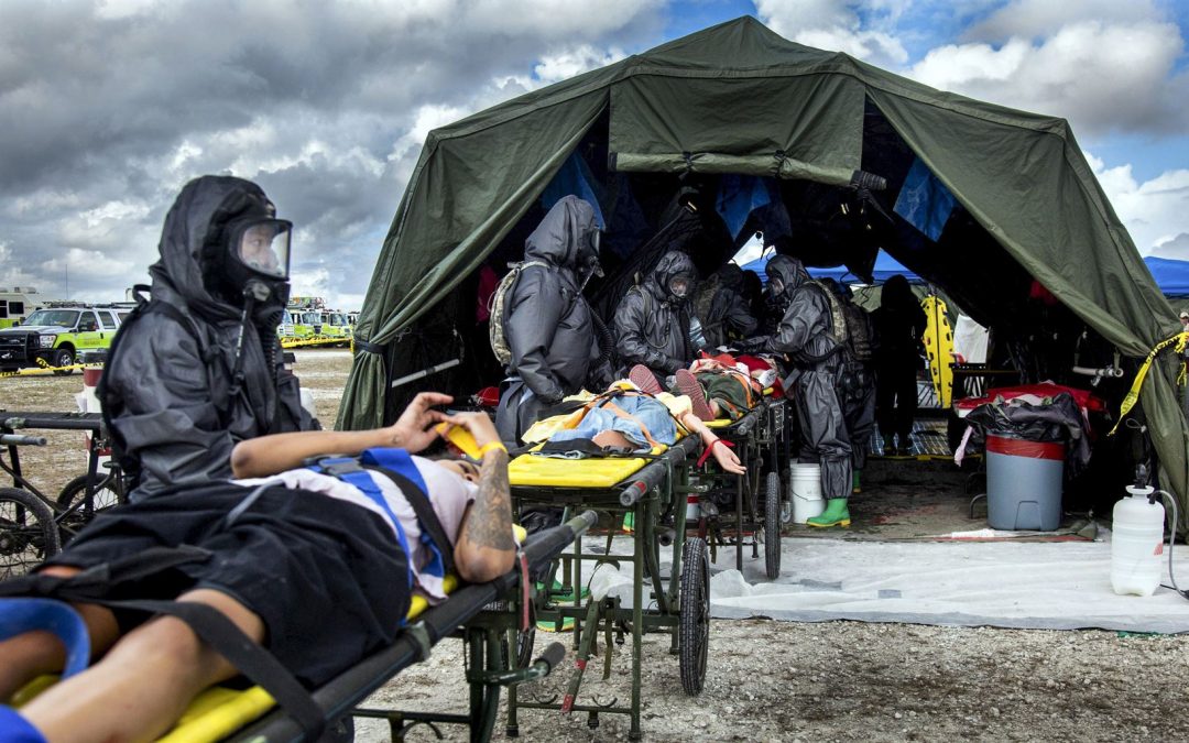 Decontamination Station Soldiers participate in simulated decontamination operations with mock casualties during a joint training exercise with Miami-Dade County first responders in Miami, Jan. 11, 2018. The soldiers are assigned to the 414th Chemical Company. Army photo by Spc. P.J. Siquig