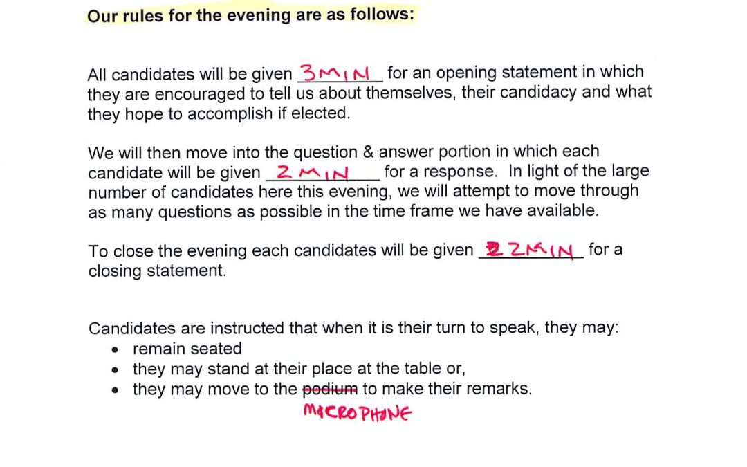New instructions handed out by the League of Women Voters for a candidates forum after I unsettled Rhine McLin and Nan Whaley by moving behind them to be seen- and to make my case.