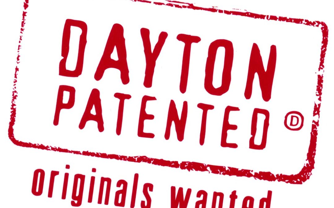 The new branding for the City of Dayton: Dayton Patented with a circle D like a Registered trademark symbol, in a rubber stamp format with the tagline “Originals wanted” underneath.
