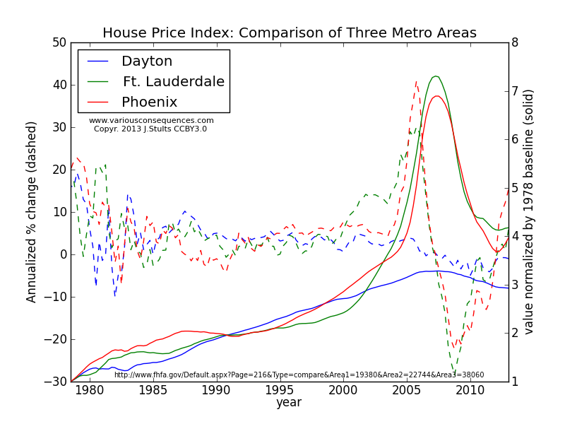 Dayton had no housing boom, so I’m not sure how accurate it is to call what we’ve experienced a “disaster”. The FHFA has a little web app that lets you compare metro areas. Just for kicks, here’s a graph comparing house price index for Ft. Lauderdale, Phoenix and Dayton.