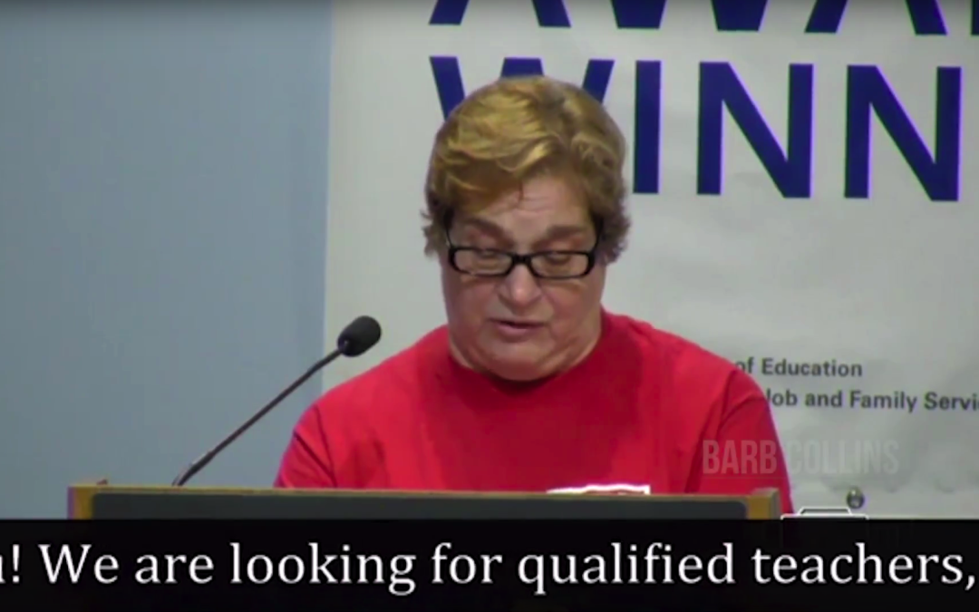 Screen shot from video broadcast by Dayton Public Schools Television of a teacher resigning at a School board meeting – and they advertise to replace her on the crawl.