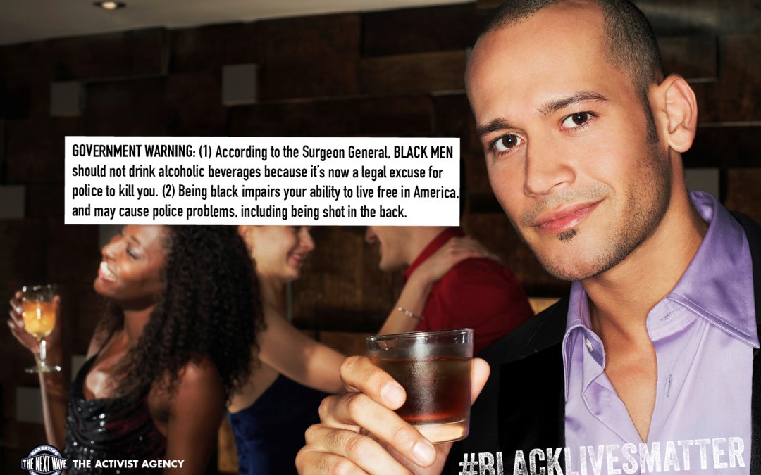 Photo of a Black man drinking alcohol- with government warning GOVERNMENT WARNING: (1) According to the Surgeon General, BLACK MEN should not drink alcoholic beverages because it’s now a legal excuse for police to kill you. (2) Being black impairs your ability to live free in America, and may cause police problems, including being shot in the back.
