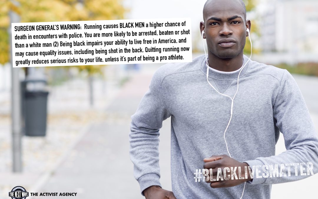 photo of Black man running with warning SURGEON GENERAL’S WARNING: Running causes BLACK MEN a higher chance of death in encounters with police. You are more likely to be arrested, beaten or shot than a white man (2) Being black impairs your ability to live free in America, and may cause equality issues, including being shot in the back. Quitting running now greatly reduces serious risks to your life, unless it’s part of being a pro athlete.