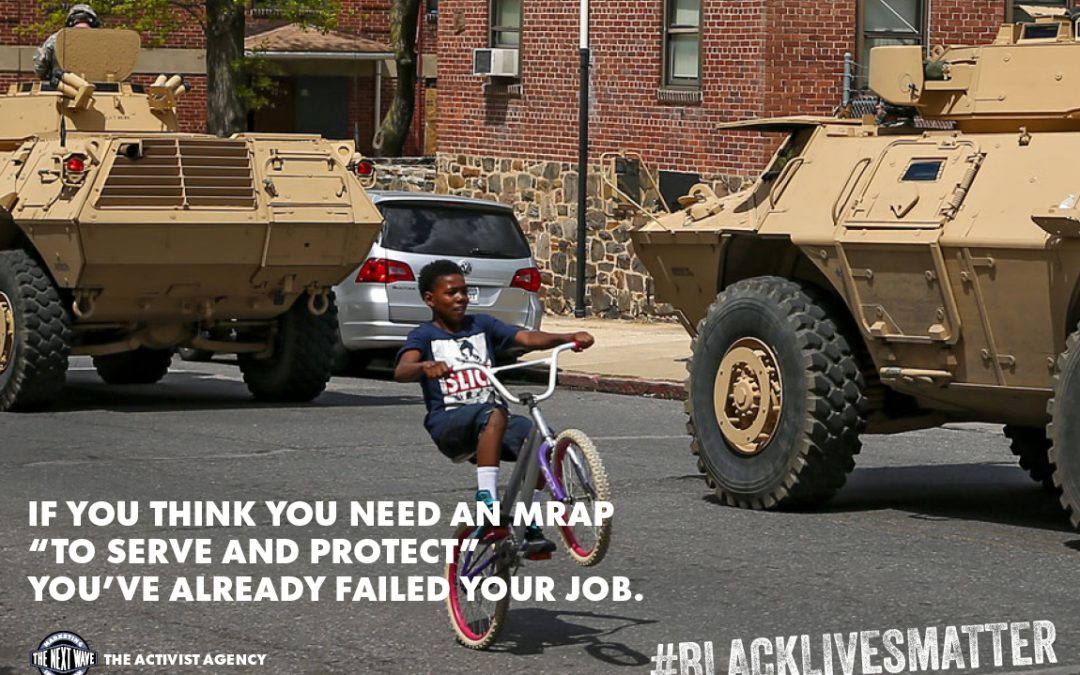 Kid on a bike riding a wheelie while cops are in armored vehicles- IF YOU THINK YOU NEED AN MRAP “TO SERVE AND PROTECT” YOU’VE ALREADY FAILED YOUR JOB. photo PATRICK SMITH/GETTY IMAGES