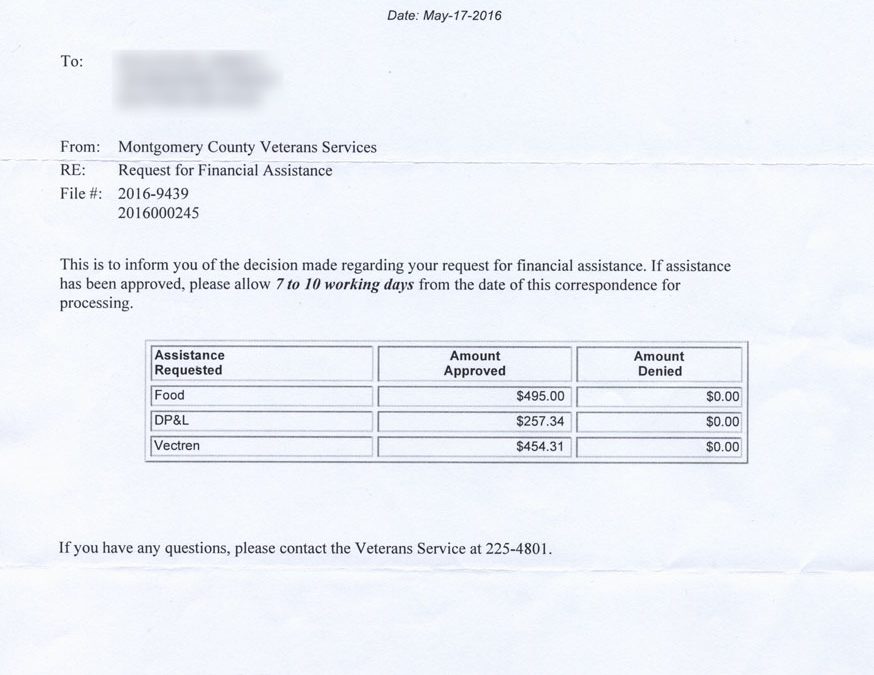 The letter promising assistance at a later date from the Montgomery County veterans Service Center
