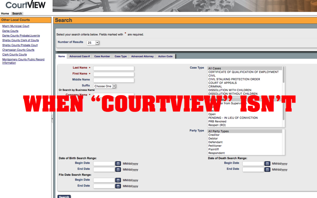 Graphic showing a non-ADA compliant and dysfunctional website used in Ohio for a clerk of courts website