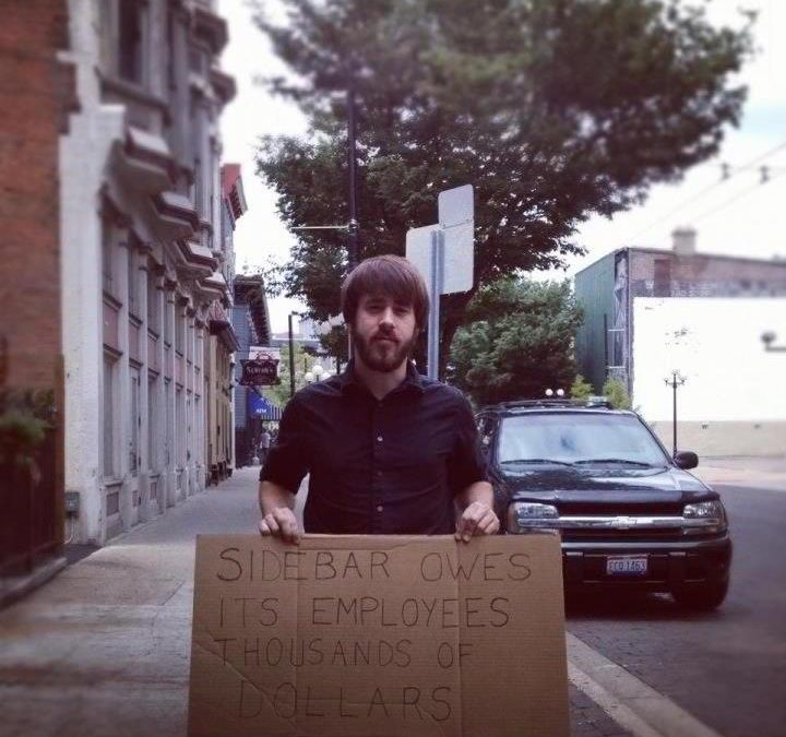 Picture of a former Sidebar Employee with a sign “Sidebar Owes it’s employees thousands of dollars”