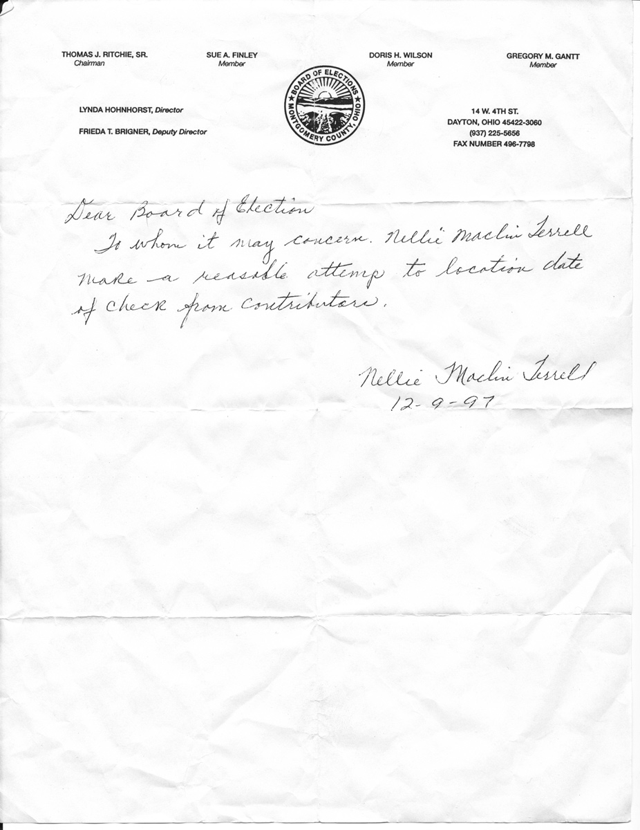 The handwritten note from Nellie Maclin Terrel letter to Montgomery County Board of Elections explaining her lack of records for donations